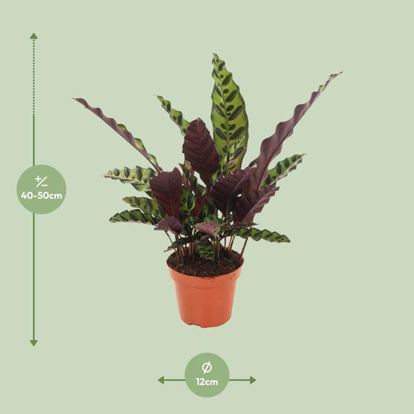 - Uniek bladpatroon: De Calathea Insignis heeft langwerpige bladeren met een lichtgroene kleur en donkergroene vlekken, terwijl de onderkant een prachtige paarsrode tint heeft. Dit maakt de plant een opvallende toevoeging aan elk interieur.