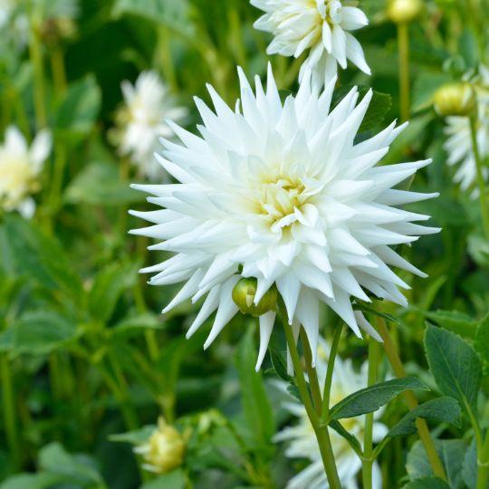 Dahlia 'Playa Blanca' schittert in elke tuin met zijn stralende witte bloemen met een subtiel geel hart. Deze heldere, zuivere kleur brengt een frisse uitstraling naar elke buitenruimte en licht donkere hoeken prachtig op. Met zijn grote, cactusvormige bloemen die tot 20 cm in diameter kunnen worden en stevige stelen die ongeveer 60 cm hoog reiken, is 'Playa Blanca' ideaal voor zowel tuinbedden als boeketten. Deze dahlia is niet alleen een blikvanger door zijn grootte, maar ook door zijn vermogen om doorlopend nieuwe bloemen te produceren wanneer de oude worden weggesneden. 'Playa Blanca' staat bekend om zijn sterke groei en langdurige bloeiperiode, waardoor het een betrouwbare en schitterende aanvulling is op elke tuin van de late lente tot aan de eerste vorst.
