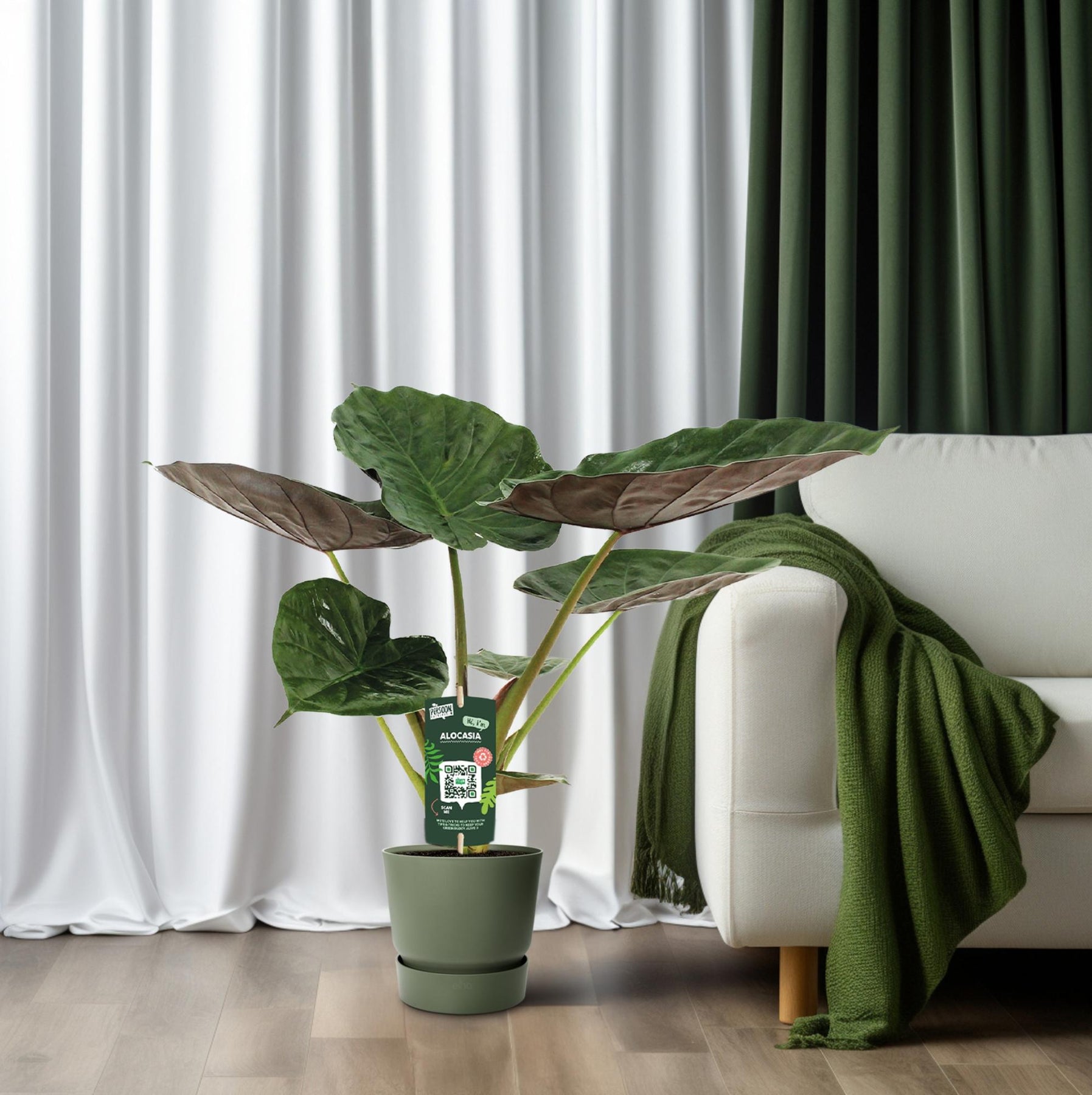 Met een huidige hoogte van ongeveer 70 cm brengt deze Alocasia een volwassen en weelderige uitstraling in elke ruimte.