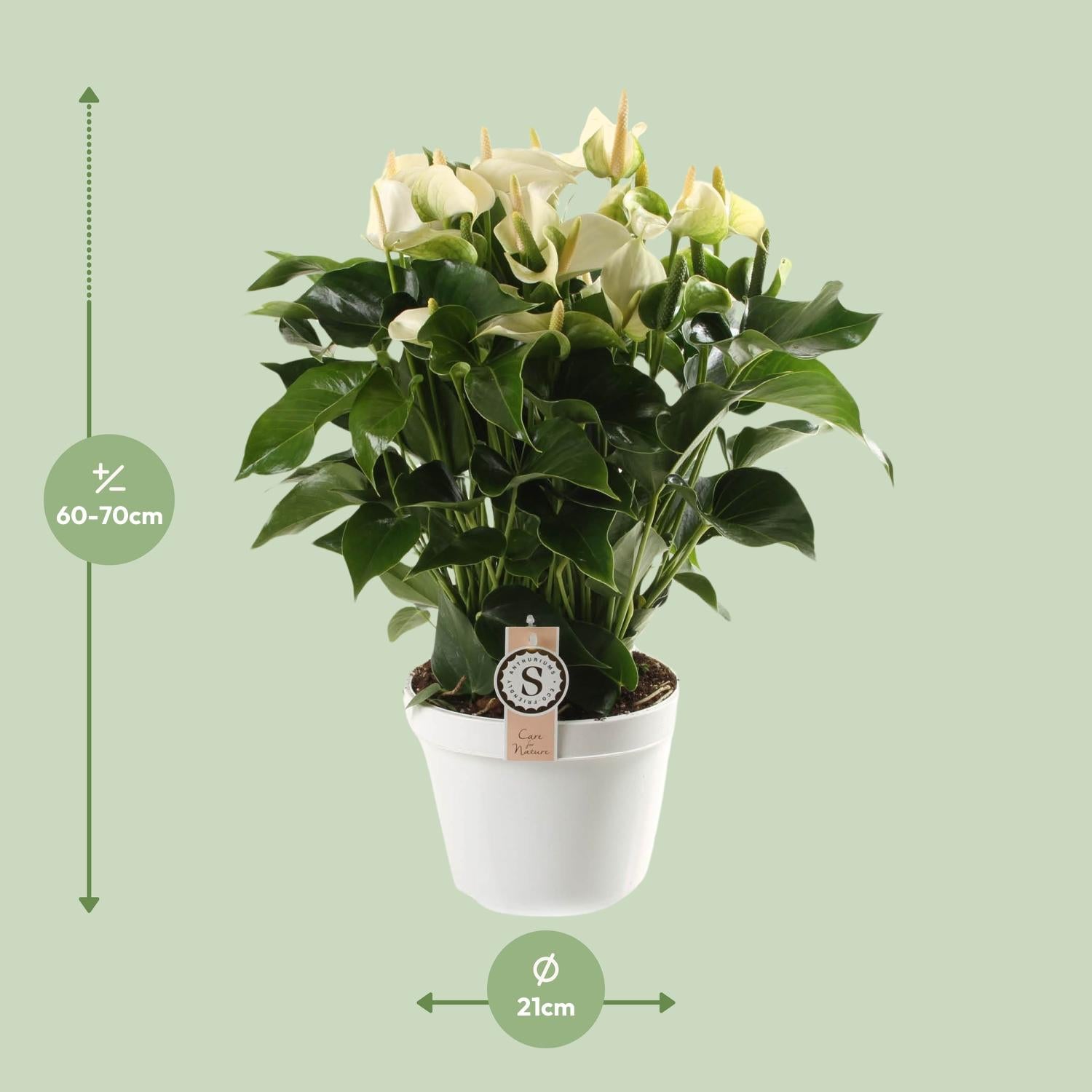 De huidige hoogte van deze Anthurium is ongeveer 65 cm. Deze plant geeft de voorkeur aan een plek in halfschaduw. Het verzorgen van de Anthurium is eenvoudig. Het uiterlijk van de Anthurium is voorzien van prachtige glanzende bladeren. Deze Anthurium wordt geleverd in een pot van 21 cm.