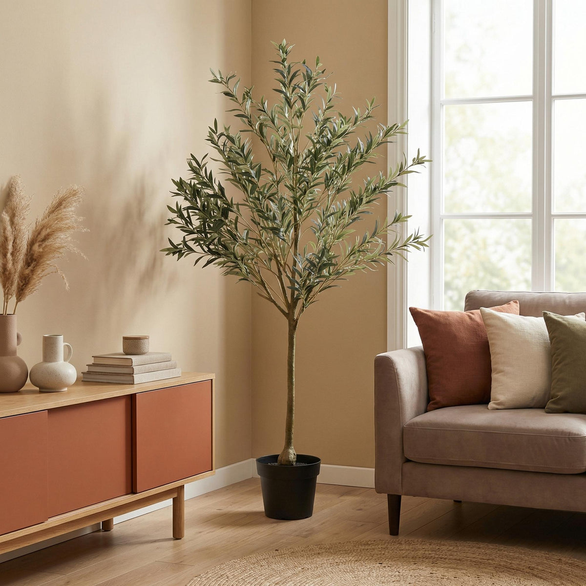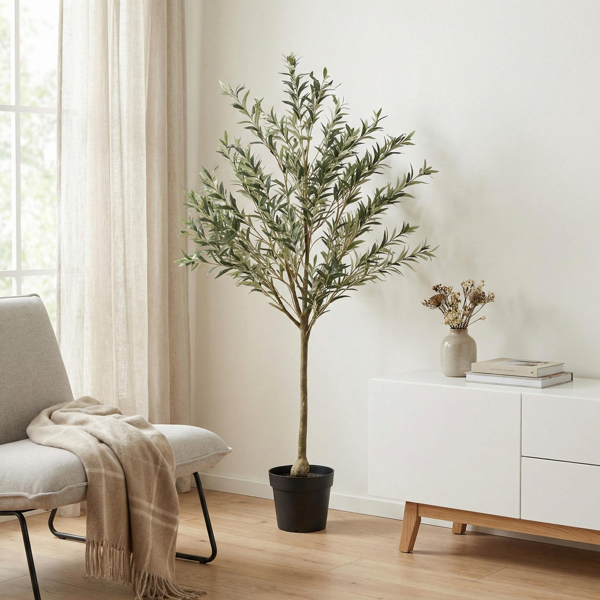 - Standplaats: De Kunst Olijfboom brengt direct een mediterrane en warme sfeer in huis of op kantoor. Met zijn slanke stam en verfijnde, grijsgroene bladeren is deze kunstboom een stijlvolle eyecatcher in de woonkamer, hal, serre of een zakelijke ruimte. Dankzij de realistische afwerking is hij nauwelijks van echt te onderscheiden.