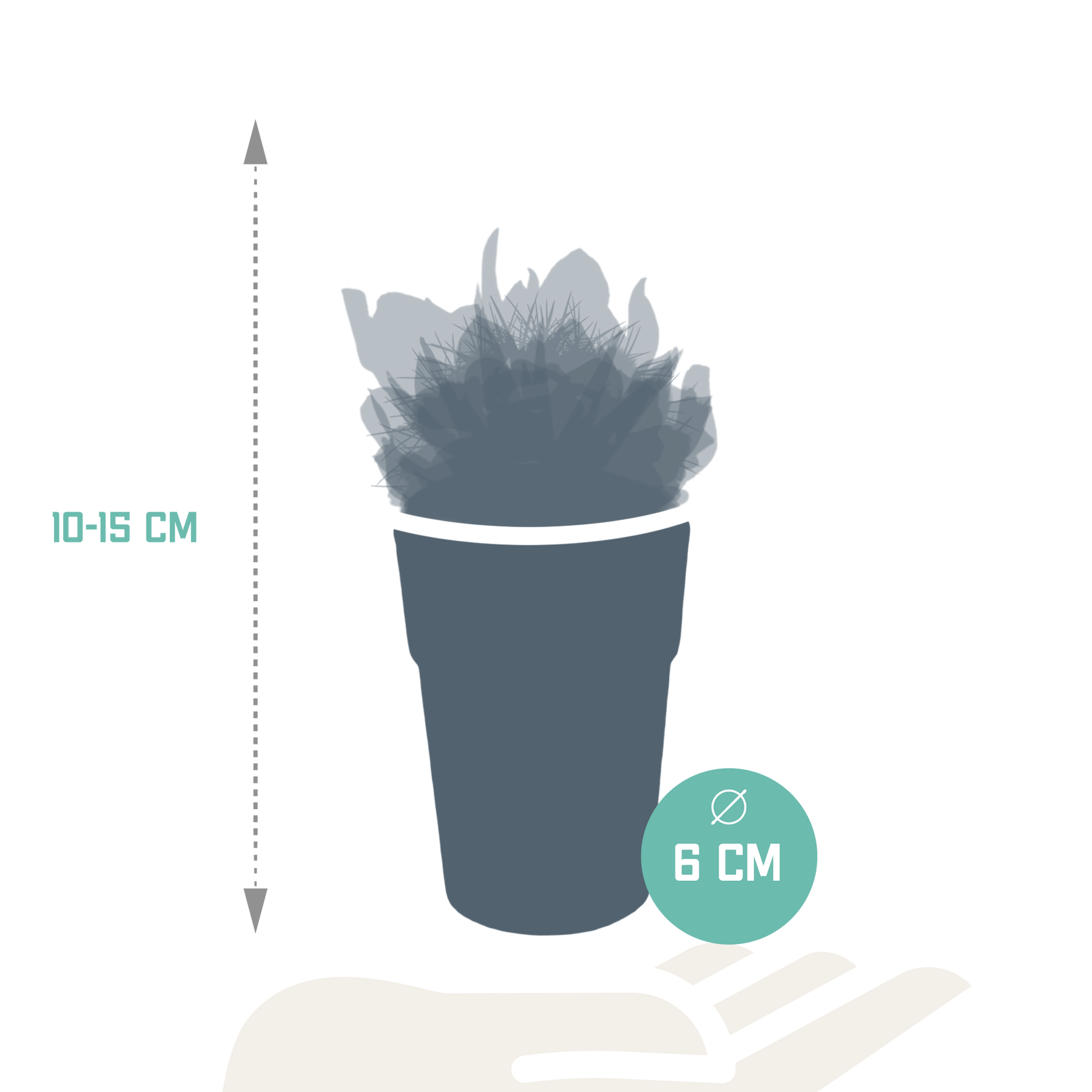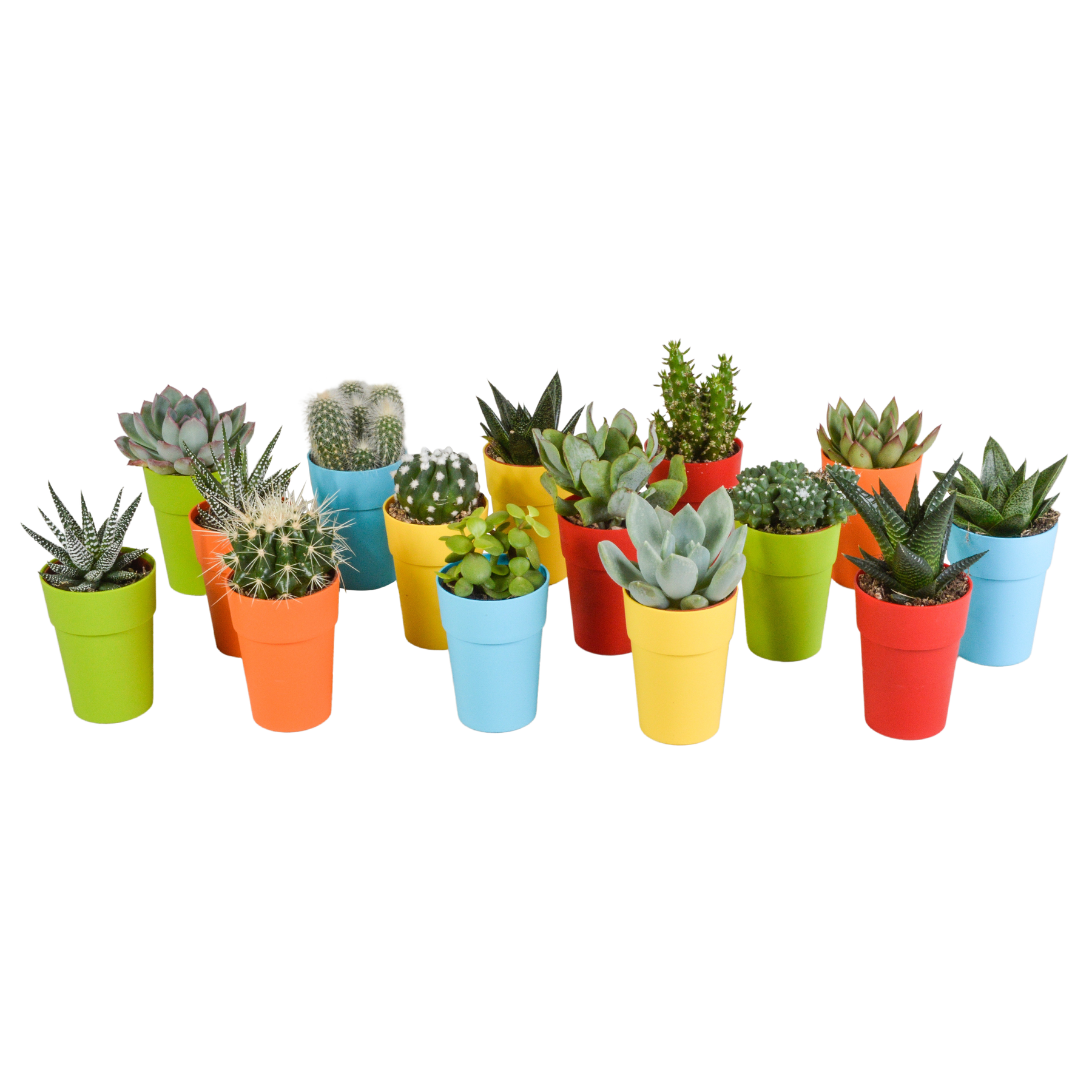 Wat een MEGA mix is dit! Deze mix bestaat uit maar liefst 15 cactussen en vetplanten die in kleur, hoogte én vorm van elkaar verschillen. Van een Cereus tot een Echeveria en van een Haworthia tot een Crassula, alles zit in deze mix. Alle planten uit deze mix komen rechtstreeks van de kweker en zijn dus van de hoogste kwaliteit. Deze mix wordt geleverd in een stoere gekleurde plasticpot.