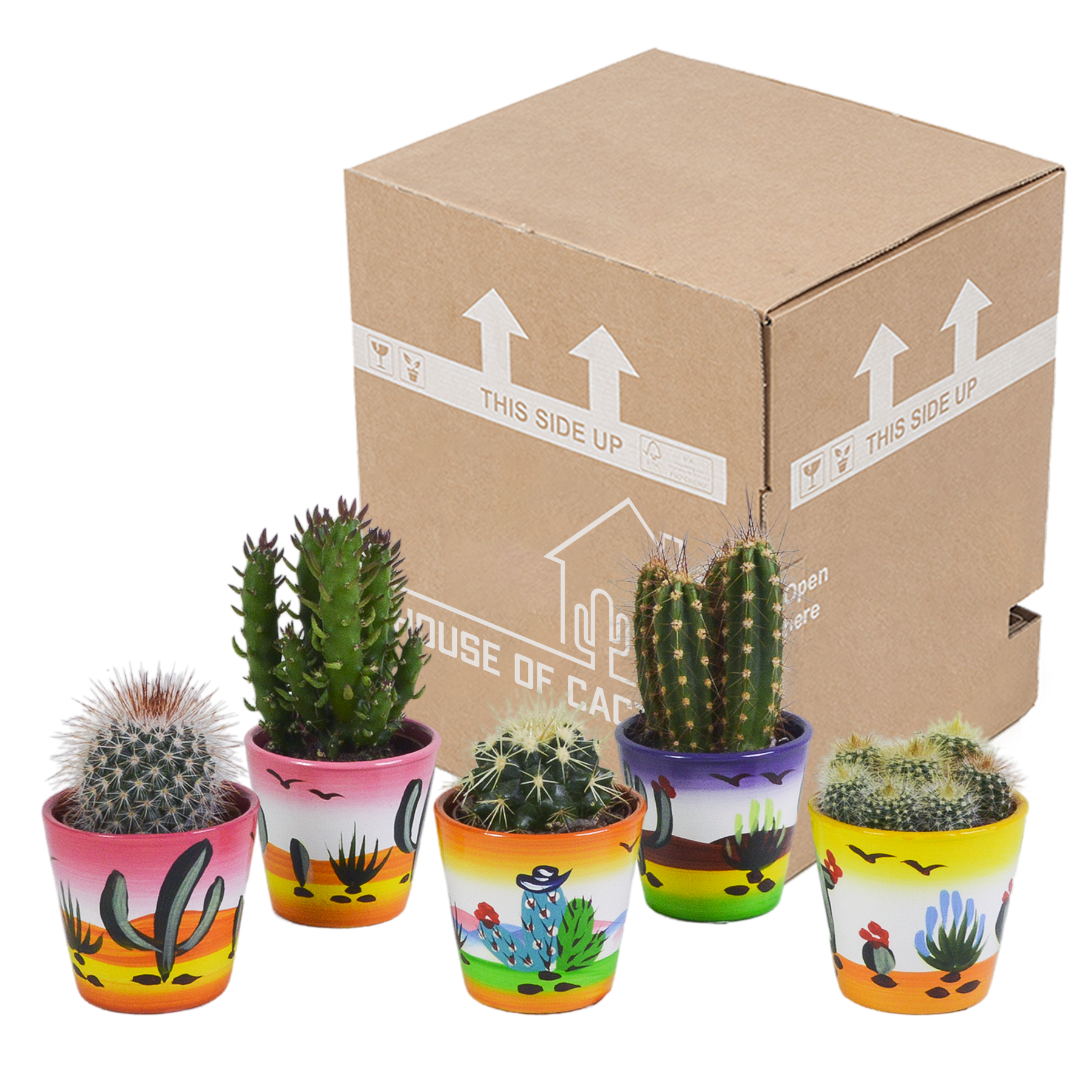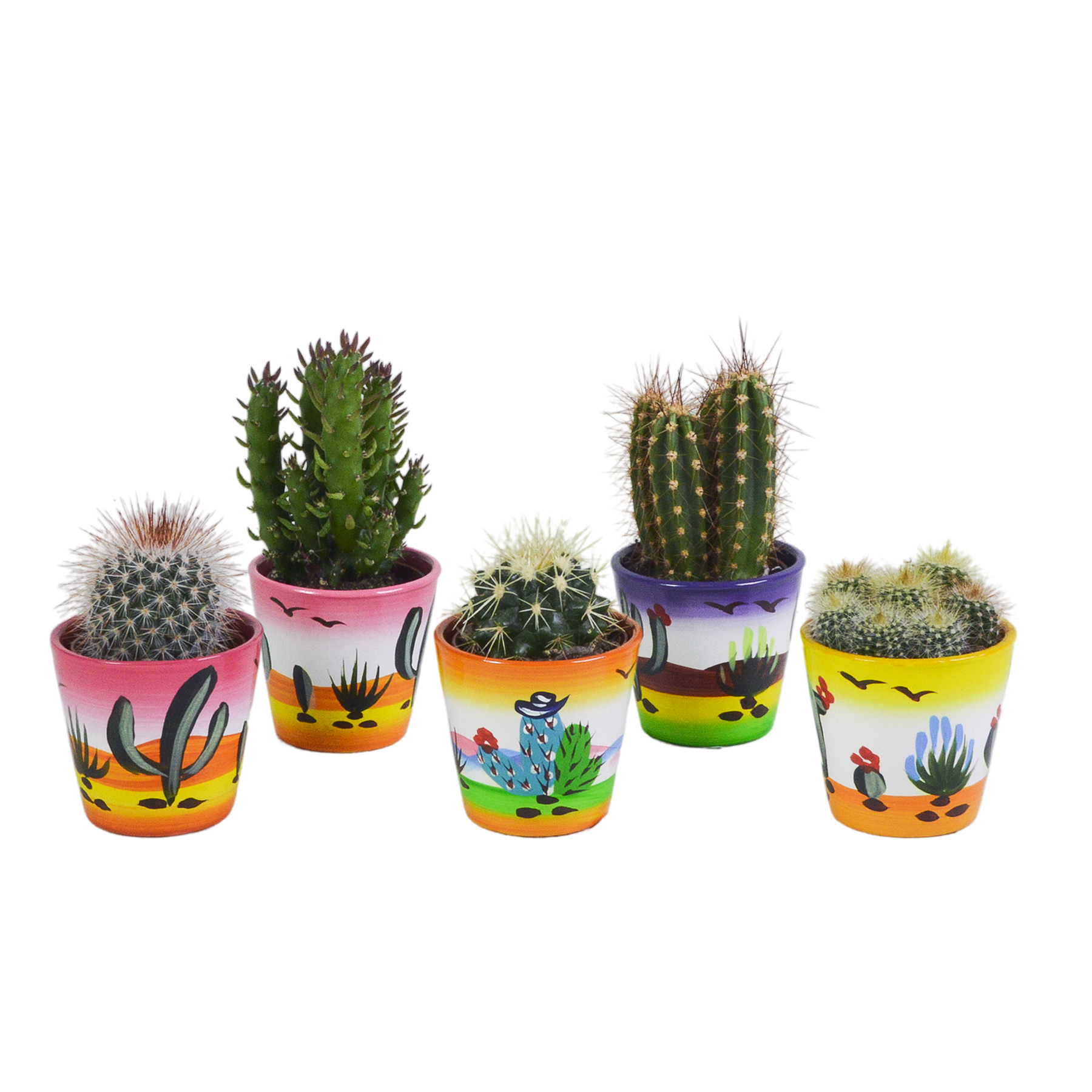 Wat een plaatje! Deze mix bestaat uit 5 cactussen die in kleur, hoogte én vorm van elkaar verschillen. De cactussen komen rechtstreeks van de kweker en zijn dus van de hoogste kwaliteit. Deze mix van parels wordt geleverd in een handgeschilderde Mexicaanse pot.