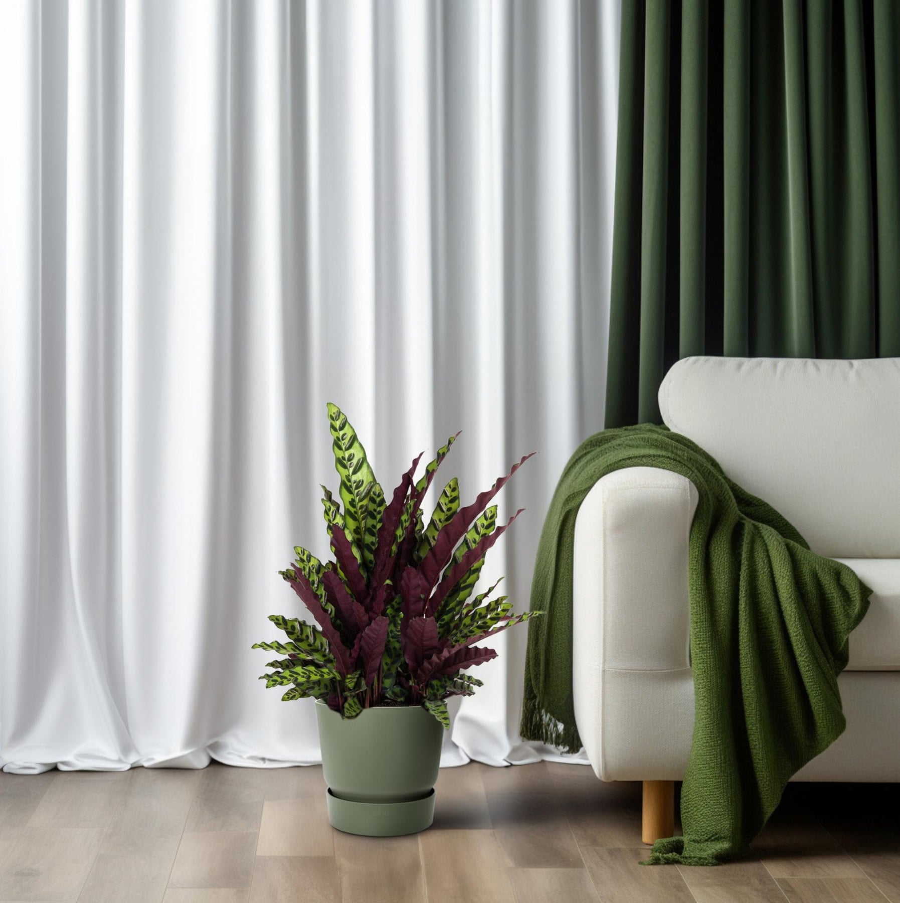 De Calathea lancifolia, ook bekend als Calathea, is een prachtige kamerplant die de charme van de tropen naar je huis brengt. Afkomstig uit de weelderige jungles van Zuid-Amerika, laat deze plant levendige groene bladeren zien met opvallende patronen, wat een vleugje elegantie toevoegt aan elke ruimte. Bekend om hun luchtzuiverende eigenschappen, is Calathea een heerlijke keuze voor liefhebbers van binnen tuinieren. Met zijn gemakkelijke verzorging zal deze wonderplant een weelderige en serene sfeer creëren, waardoor het een must-have toevoeging is aan jouw stedelijke jungle. Verhoog vandaag nog je interieurdecor met de betoverende Calathea! Maak kennis met de adembenemende Calathea lancifolia, een prachtige plant die moeiteloos een vleugje tropische schoonheid toevoegt aan elke ruimte. Deze botanische schoonheid gedijt het beste op een plek met gedeeltelijke schaduw of gedeeltelijke schaduw tot volledige schaduw. Door zijn opvallende bladpatroon is het belangrijk om deze plant regelmatig water te geven, zodat de grond altijd vochtig blijft. Of je nu een ervaren plantenliefhebber bent of een beginner, het verzorgen van de Calathea lancifolia is een fluitje van een cent. Plaats hem op een plek met indirect licht, geef hem voldoende water en zie hoe hij tot bloei komt. Upgrade je interieur vandaag nog met deze onderhoudsarme, maar visueel betoverende plant!Wist je dat Calathea lancifolia, ook wel bekend als de Rattlesnake Plant, zijn bijnaam heeft gekregen vanwege zijn unieke bladpatronen die lijken op de huid van een slang? Deze fascinerende plant komt oorspronkelijk uit de regenwouden van Brazilië en is geliefd bij plantenliefhebbers vanwege zijn prachtige bladeren. Met zijn langwerpige, lansvormige bladeren en levendige groene kleur voegt de Rattlesnake Plant een vleugje exotische schoonheid toe aan elke ruimte. Maar terwijl het verleidelijk kan zijn om een hapje te nemen van zijn verleidelijke bladeren, onthoud dat deze opvallende plant niet bedoeld is om te eten - hij is puur om van te genieten en uw interieur te verfraaien!De Calathea lancifolia, ook wel bekend als Calathea, is een mooie en populaire kamerplant.Deze plant heeft meestal een potmaat van 27 cm, waardoor het geschikt is voor middelgrote potten.Het kan groeien tot ongeveer 70 cm hoog, waardoor het een gemiddelde plant is die goed past in binnenruimtes.Calathea lancifolia gedijt op een plek met gedeeltelijke schaduw, waardoor het perfect is voor gebieden met indirect zonlicht of kamers met gefilterd licht.Leuk feitje: Calathea planten staan bekend om hun unieke vermogen om hun bladeren 's nachts te sluiten en ze 's ochtends weer te openen, waardoor ze de bijnaam "prayer plants" krijgen.
