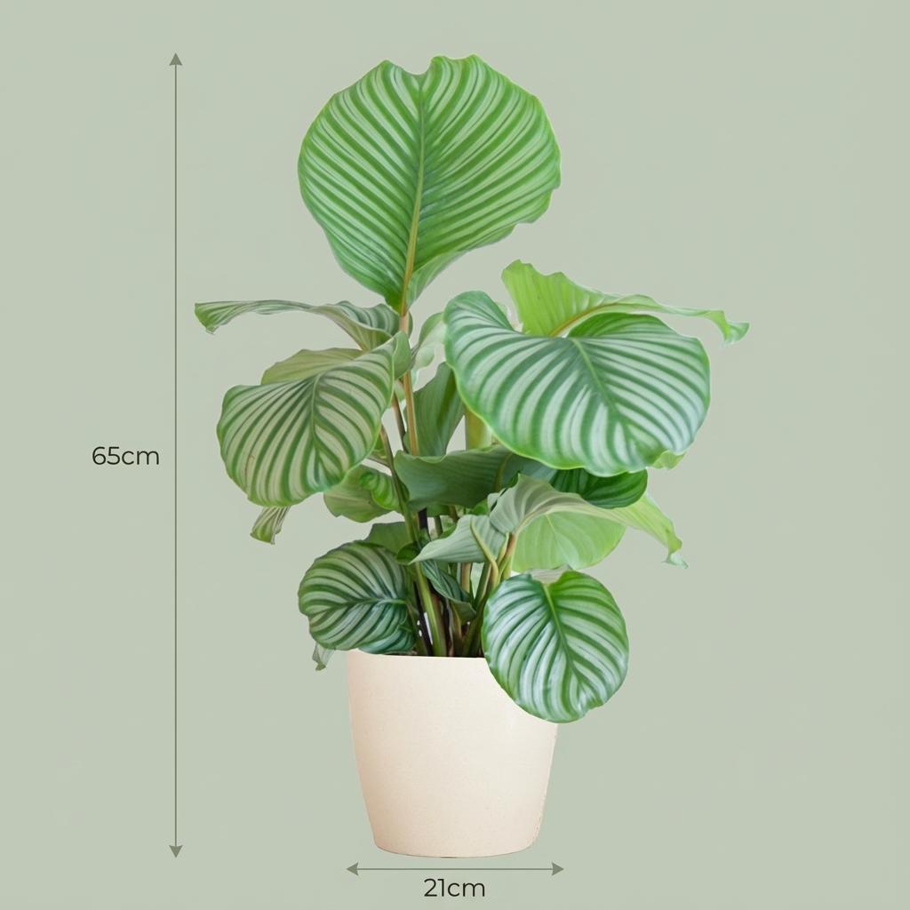 De Calathea orbifolia is een prachtige groene kamerplant met luchtzuiverende eigenschappen! Haar indrukwekkende, grote bladeren zijn heldergroen met mintgroene strepen, wat een knallend effect geeft. Deze plant is een visueel spektakel met zijn opvallende kleuren! De Calathea is erg geliefd en vaak te vinden in woonbladen en op sociale media. Een interessant weetje is dat de bladeren van de Calathea 's nachts sluiten en 's ochtends weer opengaan! Soms hoor je 's avonds het ritselende geluid van deze kamerplant.
