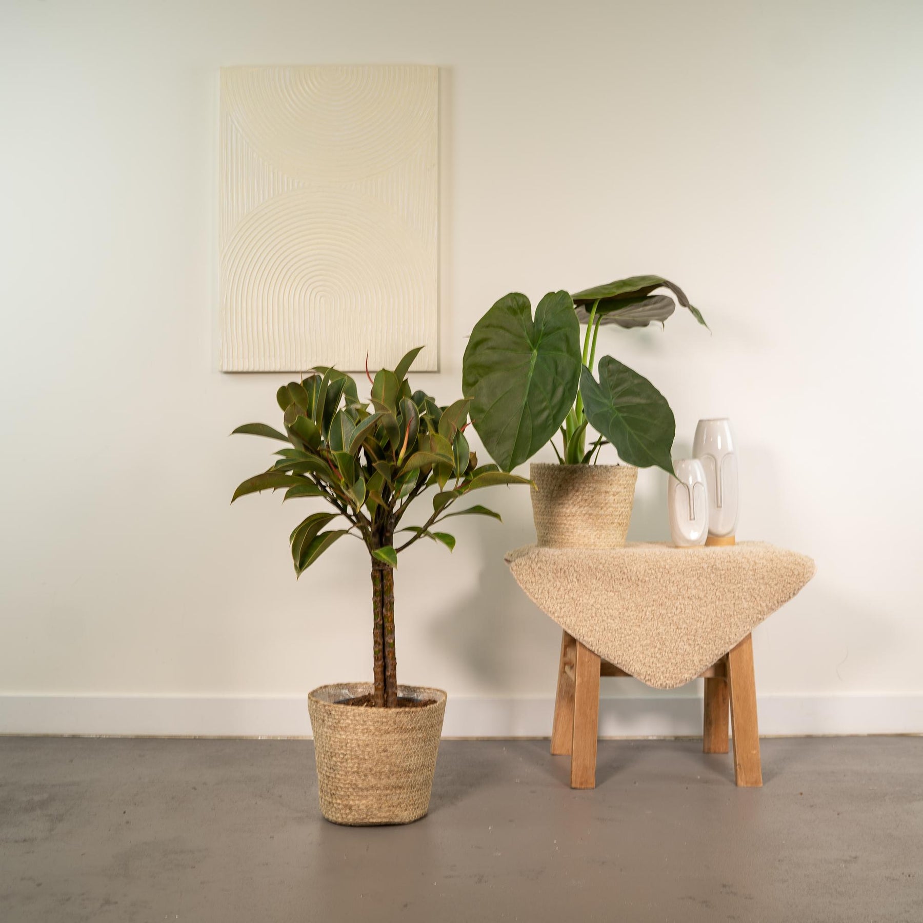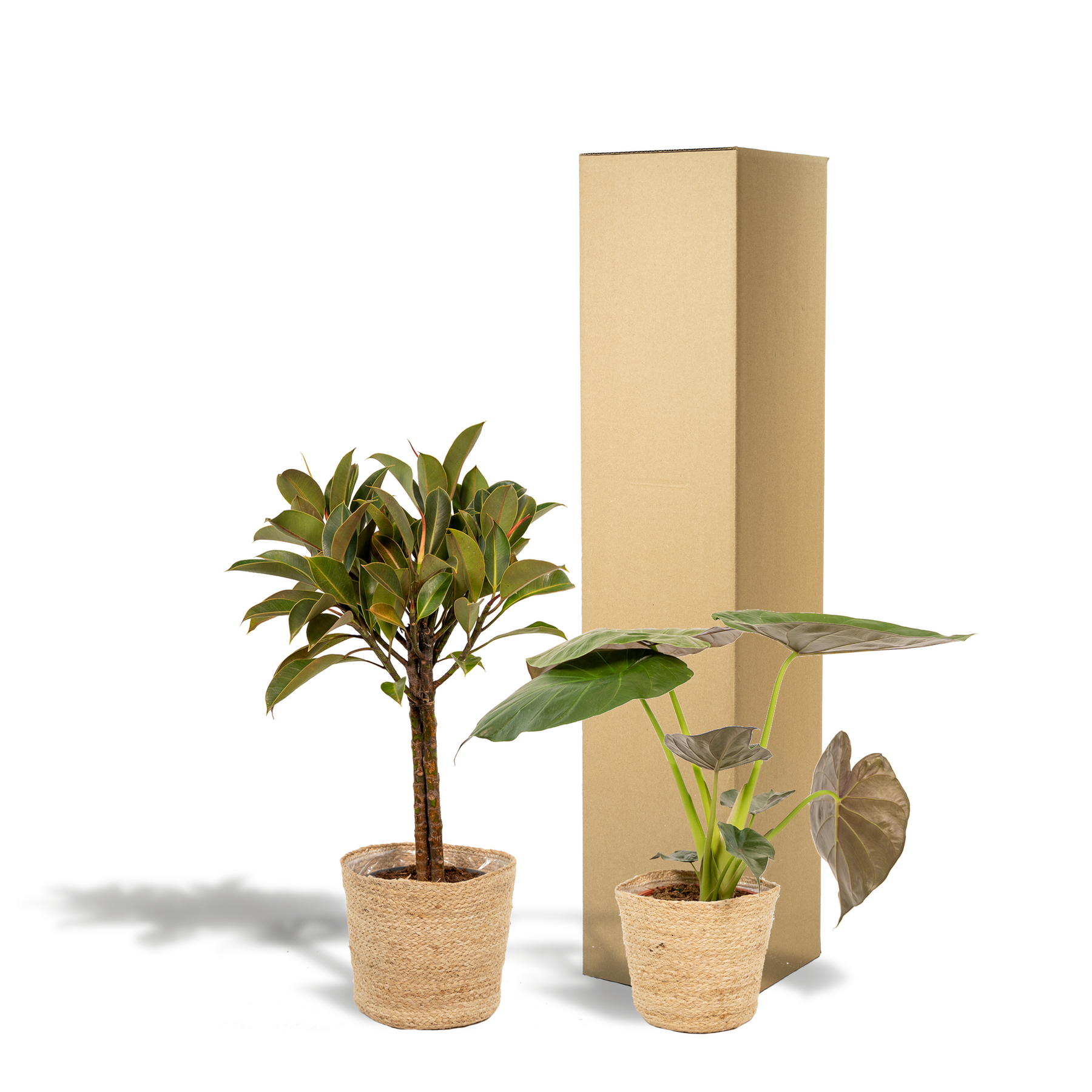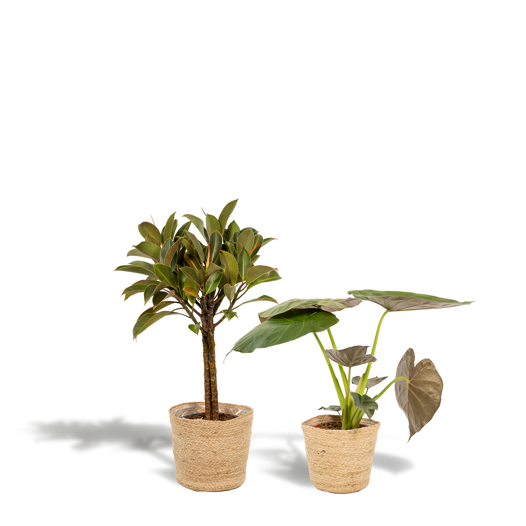 Ficus Elastica Melany - Ø21cm - ↕85cm + Alocasia Wentii - Ø19cm - ↕60cm + Mand Selin