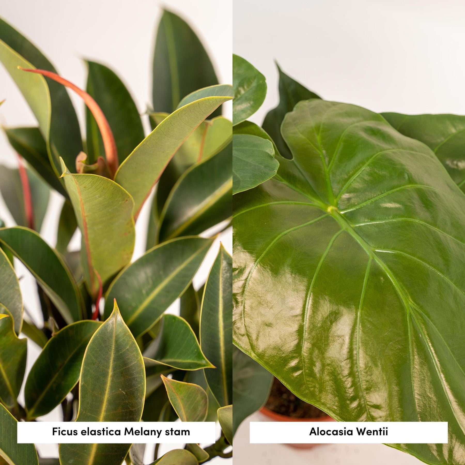 Deze kamerplantenmix zorgt voor een groene vibe in huis. De Ficus Elastica Melany en de Alocasia Wentii zijn de ideale ingrediënten voor een tropische cocktail.