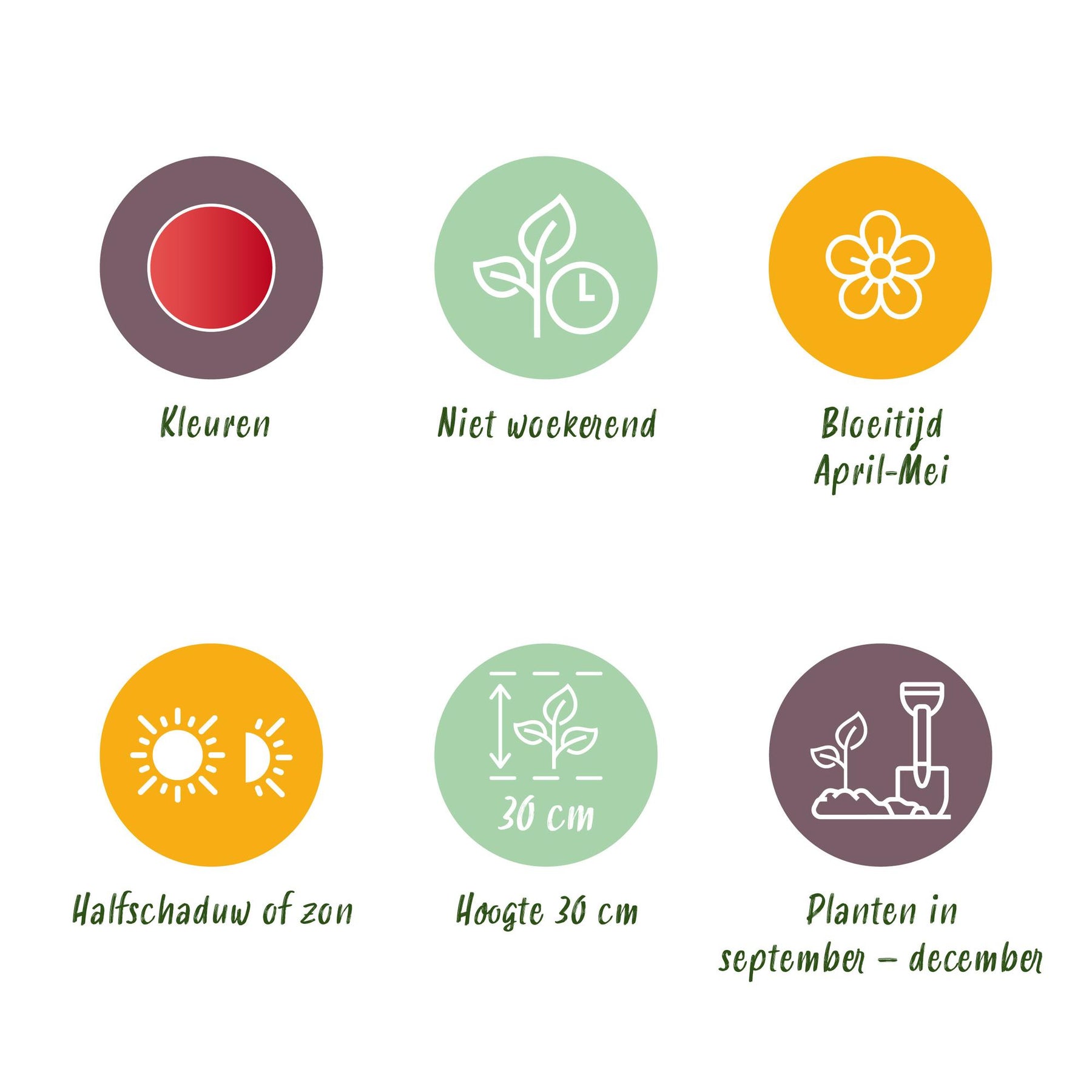 Met hun opvallende kleur zijn ze niet alleen een lust voor het oog, maar ook een geweldige aanvulling op je buitenruimte. De Tulipa Greigii Red bloeit in het vroege voorjaar, waardoor je tuin of balkon al vroeg in het seizoen tot leven komt.