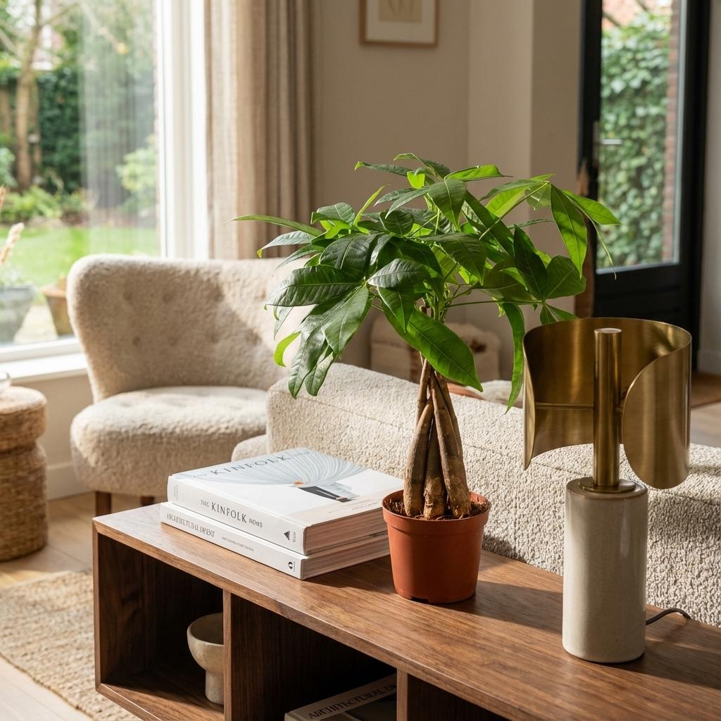 Wat deze kamerplant echt geliefd maakt, is het gemak in onderhoud. De Pachira Aquatica is een sterke plant die weinig eisen stelt aan zijn verzorging. De plant slaat water op in zijn dikke stam, waardoor hij prima een periode zonder water kan. Dit maakt hem de ideale metgezel voor mensen die af en toe vergeten water te geven of voor een kantooromgeving waar de verzorging soms wordt overgeslagen. Naast zijn esthetische waarde is deze plant ook een uitstekende luchtzuiveraar, waardoor hij bijdraagt aan een gezonder leefklimaat door schadelijke stoffen uit de lucht te filteren.