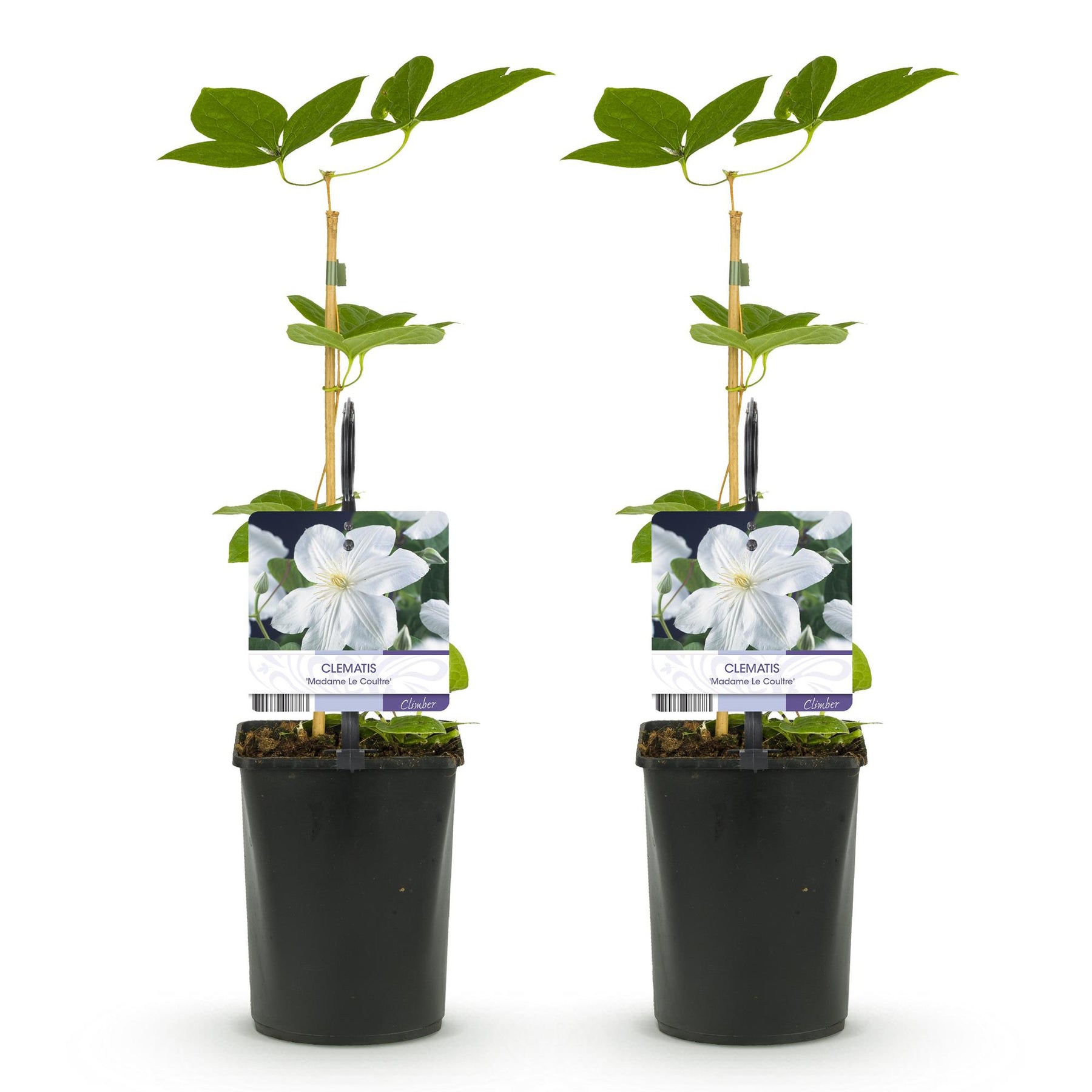 "Clematis 'Madame Le Coultre' is een prachtige klimplant die bekend staat om zijn grote, romige witte bloemen. Deze plant bloeit rijkelijk van de late lente tot de vroege herfst, waardoor je tuin het hele seizoen door verfraaid wordt. De bloemen hebben een delicate geur en zijn perfect voor het bedekken van pergola's, hekken of muren.