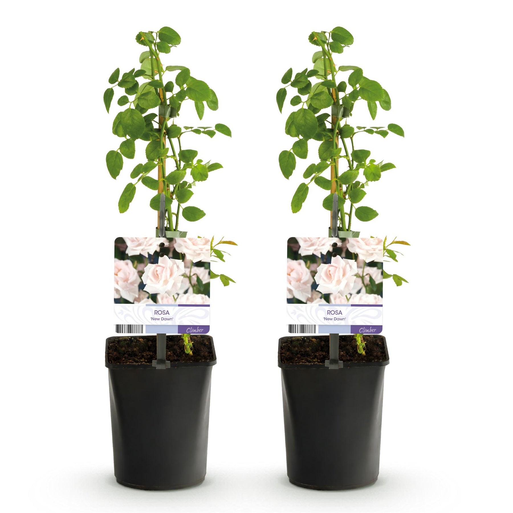 "Rosa 'New Dawn' is een prachtige rozenplant die bekend staat om zijn elegante bloei en rijke geur. Deze klimroos produceert grote, zachtroze bloemen die in trossen groeien. De bloeiperiode is lang, waardoor je gedurende het seizoen kunt genieten van een overvloed aan bloemen.