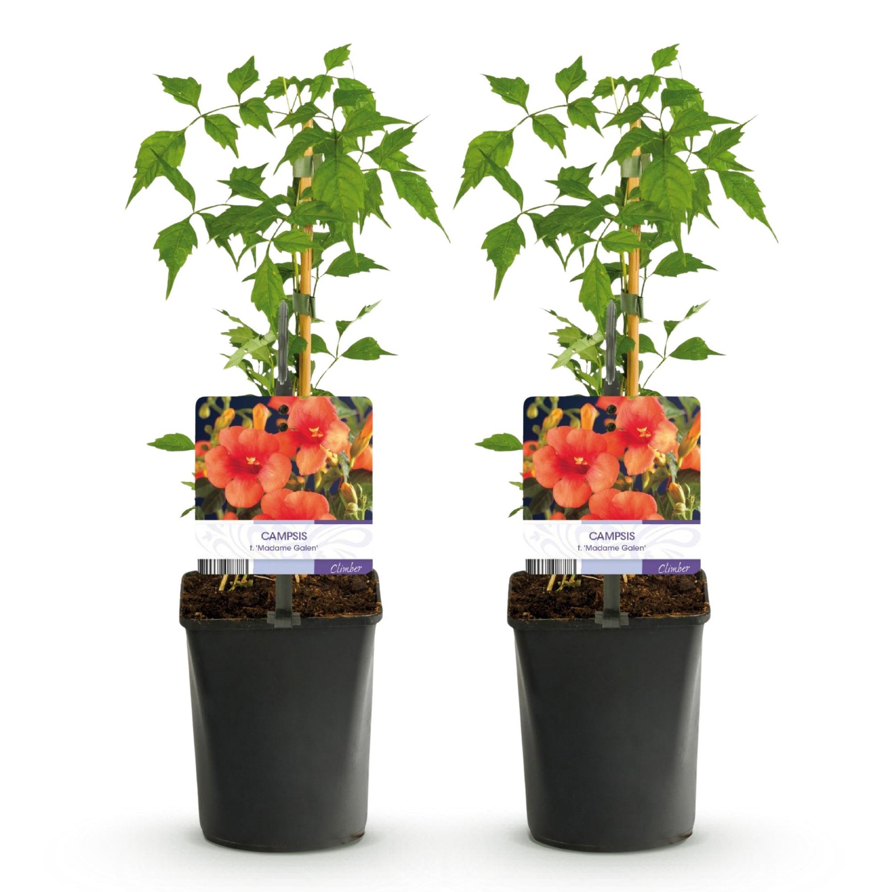Geniet van de spectaculaire bloei en het weelderige groen van de Campsis radicans Madame Galen in uw tuin!