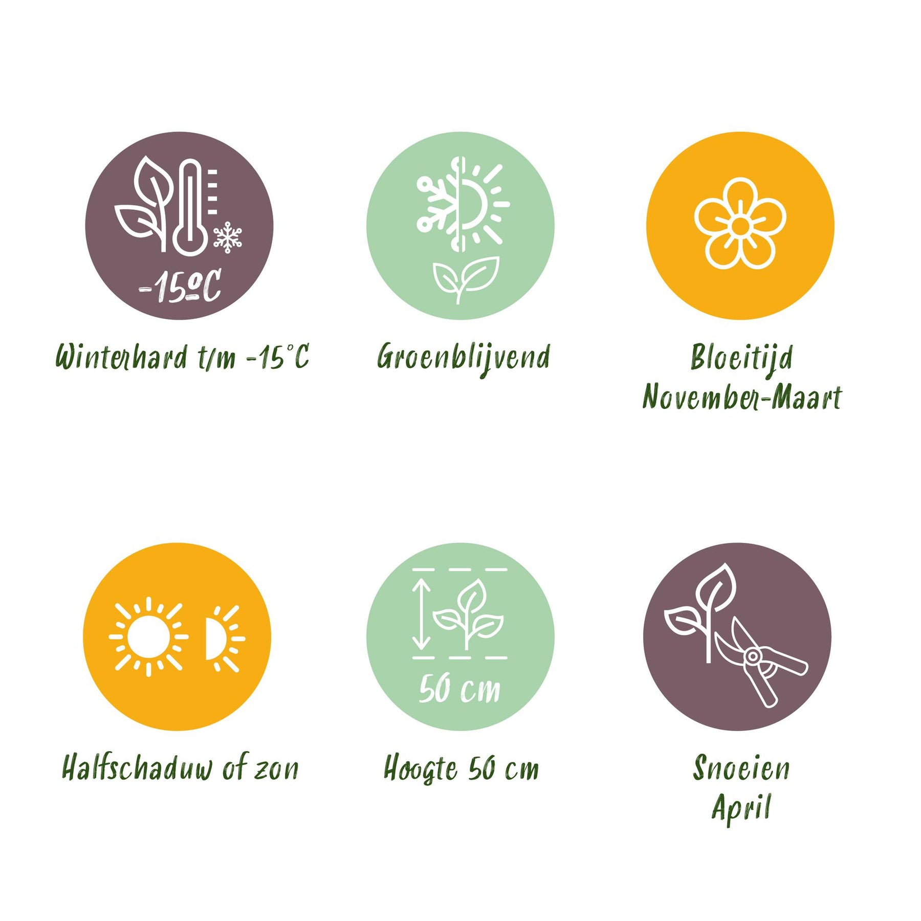 De Helleborus niger Christmas Carol produceert elegant witte bloemen in de winter, waardoor het een unieke toevoeging is aan uw tuin of buitenruimte. Deze plant is niet alleen visueel aantrekkelijk, maar ook een geweldige keuze voor tuiniers die willen genieten van kleur tijdens de koudere maanden.