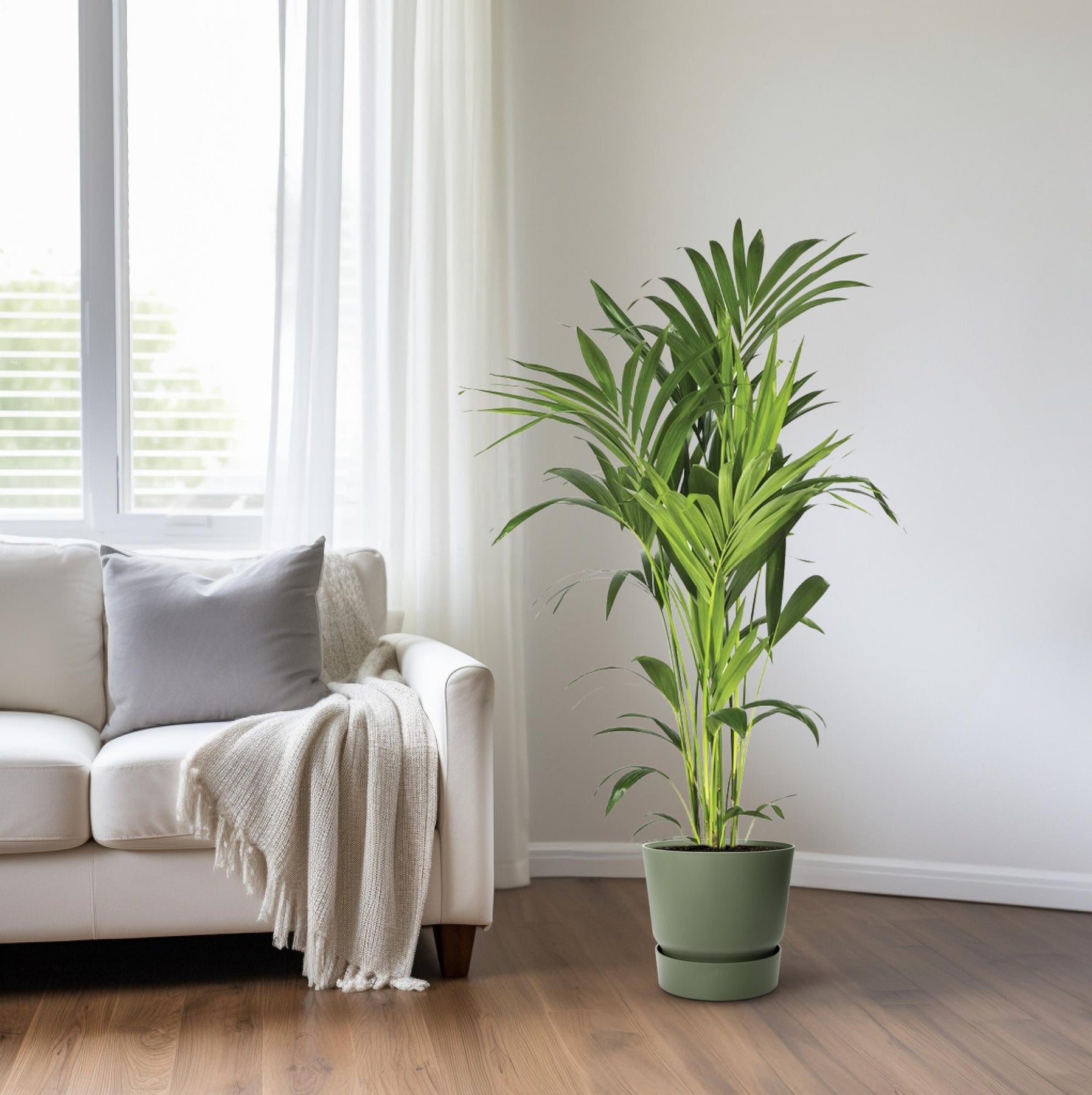 De Kentiapalm, ook bekend als Howea, is een populaire kamerplant die bekend staat om zijn gracieuze uiterlijk en eenvoudig onderhoud. Hij komt oorspronkelijk uit de weelderige regenwouden van het Lord Howe-eiland, gelegen voor de oostkust van Australië. Deze plant gedijt goed in warme klimaten met temperaturen variërend van 18 tot 29 graden Celsius en matige tot hoge luchtvochtigheid. Zijn natuurlijke habitat verklaart waarom het zo'n populaire keuze is voor binnenbeplanting, omdat het goed past bij de omstandigheden die in de meeste huizen en kantoren worden aangetroffen. De Howea-palm is een langzaam groeiende plant die een hoogte van wel 3 meter kan bereiken, waardoor het een ideale keuze is voor mensen die wat groen aan hun binnenruimtes willen toevoegen zonder te veel ruimte op te offeren. Zijn lange, boogvormige bladeren en elegante vorm maken het een geliefde keuze onder interieurontwerpers en huiseigenaren. Met zijn vermogen om de lucht te zuiveren door gifstoffen zoals formaldehyde en benzeen te verwijderen, is de Kentiapalm niet alleen een mooie toevoeging aan elke ruimte, maar biedt het ook extra gezondheidsvoordelen. Howea, ook bekend als Kentia Palm, gedijt op een plek met halfschaduw of schaduw, waardoor het een uitstekende kamerplant is. Het vereist eens per week water geven om de grond consistent vochtig maar niet drassig te houden. Kentia Palm geeft de voorkeur aan goed doorlatende grond verrijkt met organisch materiaal. Om een gezonde groei te bevorderen, is het raadzaam om de plant elke maand tijdens de lente en zomermaanden te bemesten. Zorg er echter voor dat je de meststof verdund tot de helft van de aanbevolen sterkte om overbemesting van de Kentia Palm te voorkomen. De Kentia Palm is een populaire keuze voor binnengebruik vanwege zijn vermogen om te gedijen onder slechte lichtomstandigheden. De elegante bladeren en hoge, slanke stam maken het een perfecte toevoeging aan elke binnenruimte, waar het een vleugje tropische sfeer geeft en de luchtkwaliteit verbetert. Deze Kentia Palm wordt geleverd in een maat van 21 cm, perfect om een vleugje groen toe te voegen aan elke ruimte. De huidige hoogte van deze Kentia Palm is ongeveer 130 cm, waardoor het een statementstuk is voor elke kamer. Plaats deze plant op een plek met halfschaduw, omdat de Kentia Palm gedijt in dit soort omgeving. Het verzorgen van de Kentia Palm is een fluitje van een cent, waardoor het een ideale keuze is voor plantenliefhebbers van elk ervaringsniveau. Met zijn gracieuze bladeren en glanzende bladeren voegt de Kentia Palm een elegante touch toe aan elk interieur.