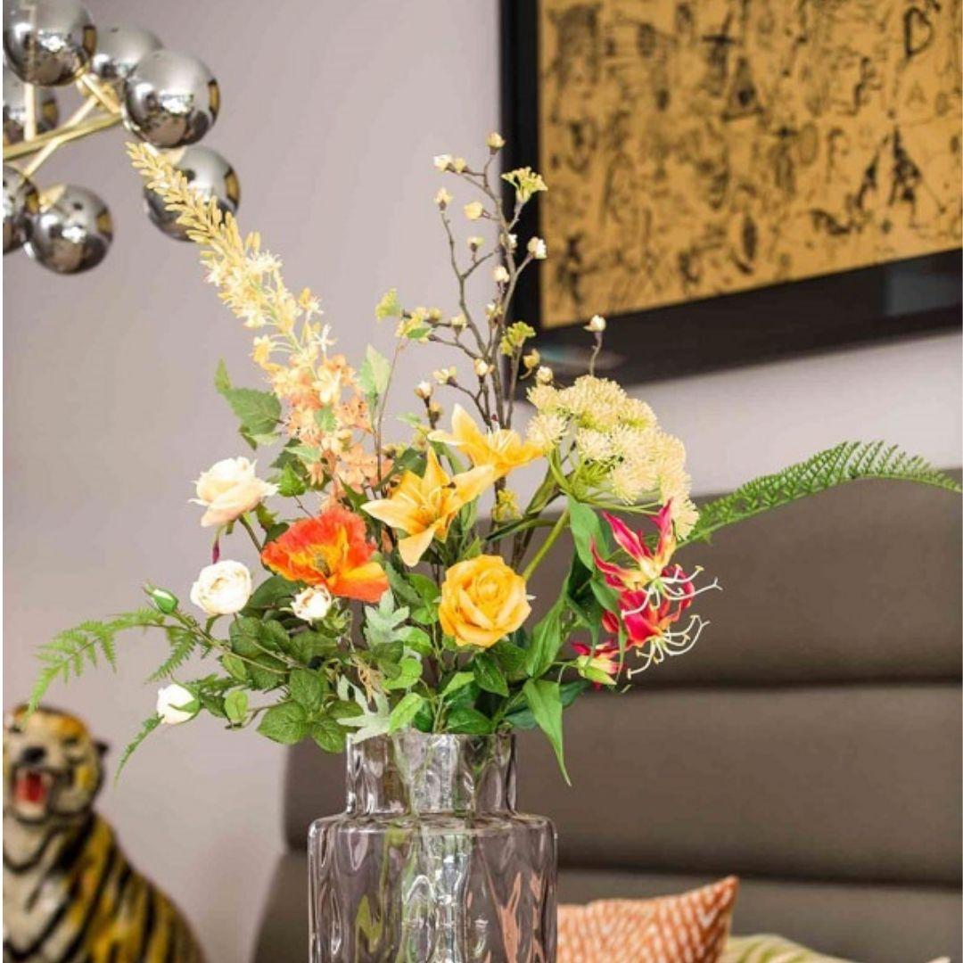 Dit luchtige boeket combineert zachte perziktinten, warme amberkleuren, bloeiende takken en verfijnd groen tot een sierlijk geheel. Met een hoogte van ca. 105 cm en 12 zorgvuldig geplaatste stelen brengt het een uitnodigende sfeer in elke ruimte. Dankzij de real touch-afwerking zien de bloemen er levensecht uit en voelen ze ook zo aan – zonder te verwelken, verkleuren of moeite te doen. Perfect voor entrees, eetkamers, kantoren of boetiekinterieurs.