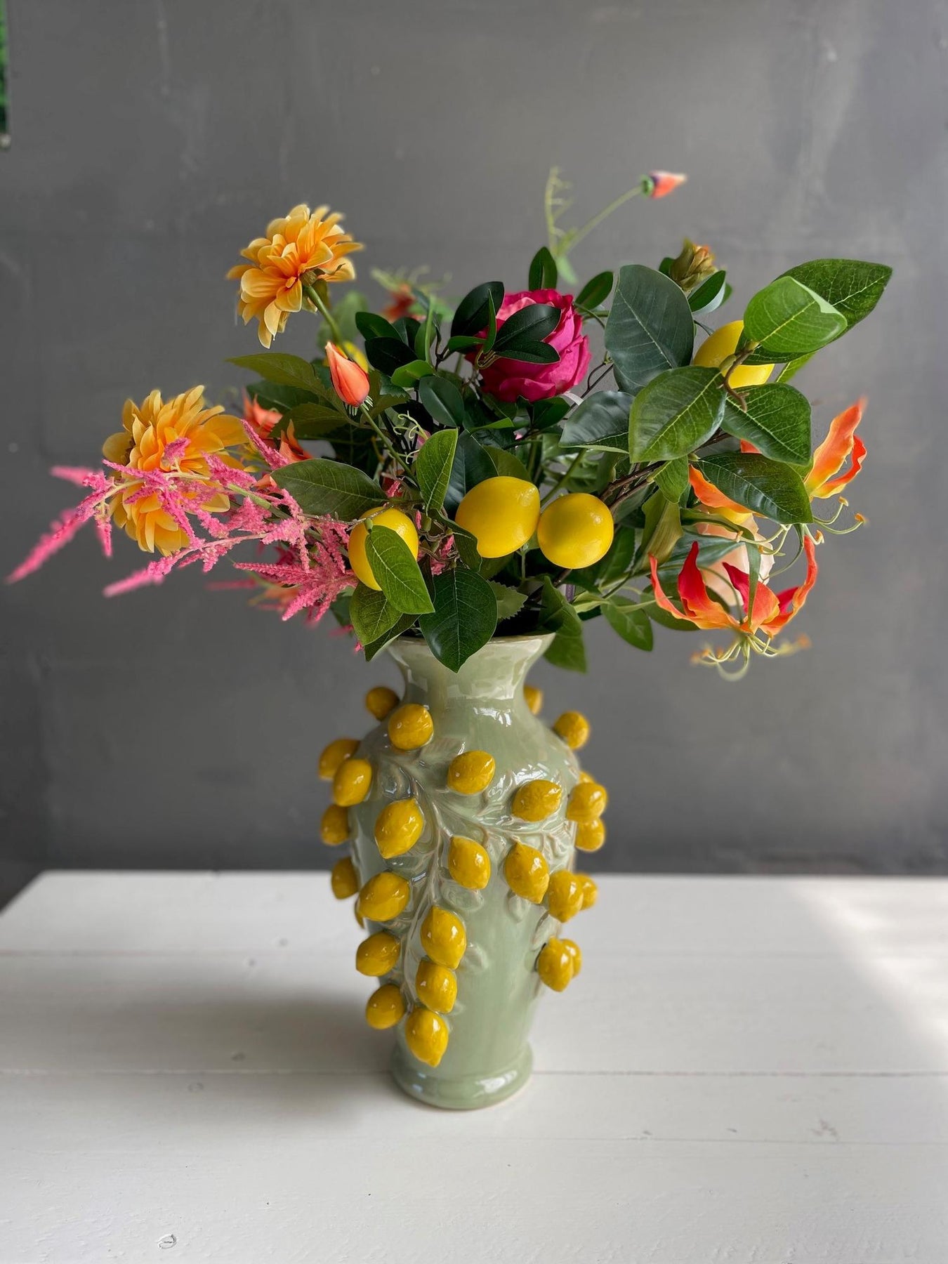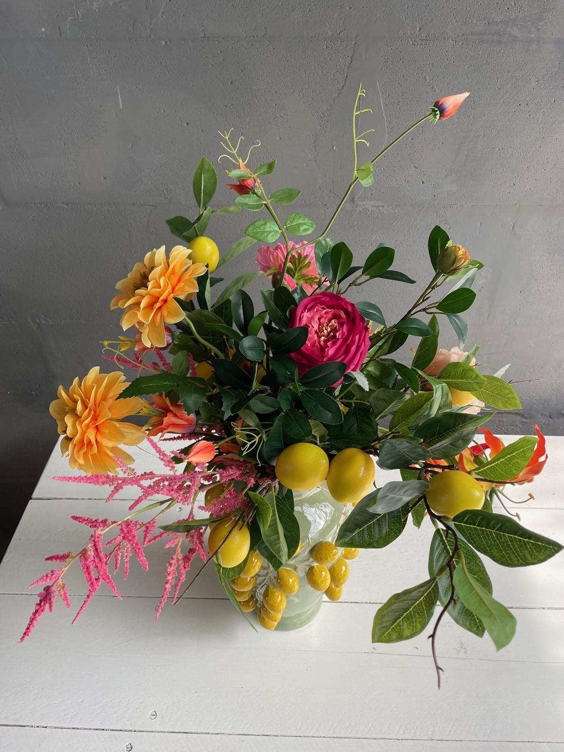 Kleur in overvloed! Dit schitterende kunstboeket brengt meteen sfeer in jouw interieur. De kleurencombinatie geeft het boeket een vrolijke uitstraling. Daarmee is het een geweldige manier om iedere ruimte op te leuken. Of je het nu toevoegt aan je woonkamer, hal of thuiskantoor, dit boeket maakt blijvend indruk.