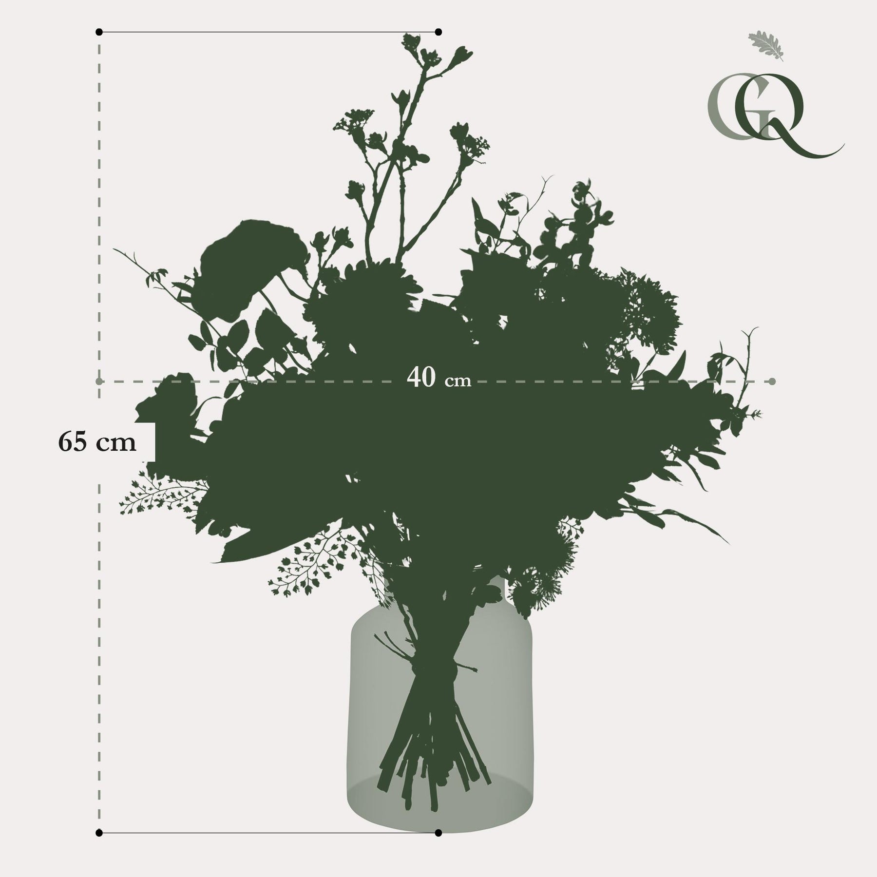 Geniet van de pracht en praal van dit boeket bloemen zonder je zorgen te maken over onderhoud. Deze kunstbloemen hebben geen water nodig en behouden heel lang hun schoonheid.