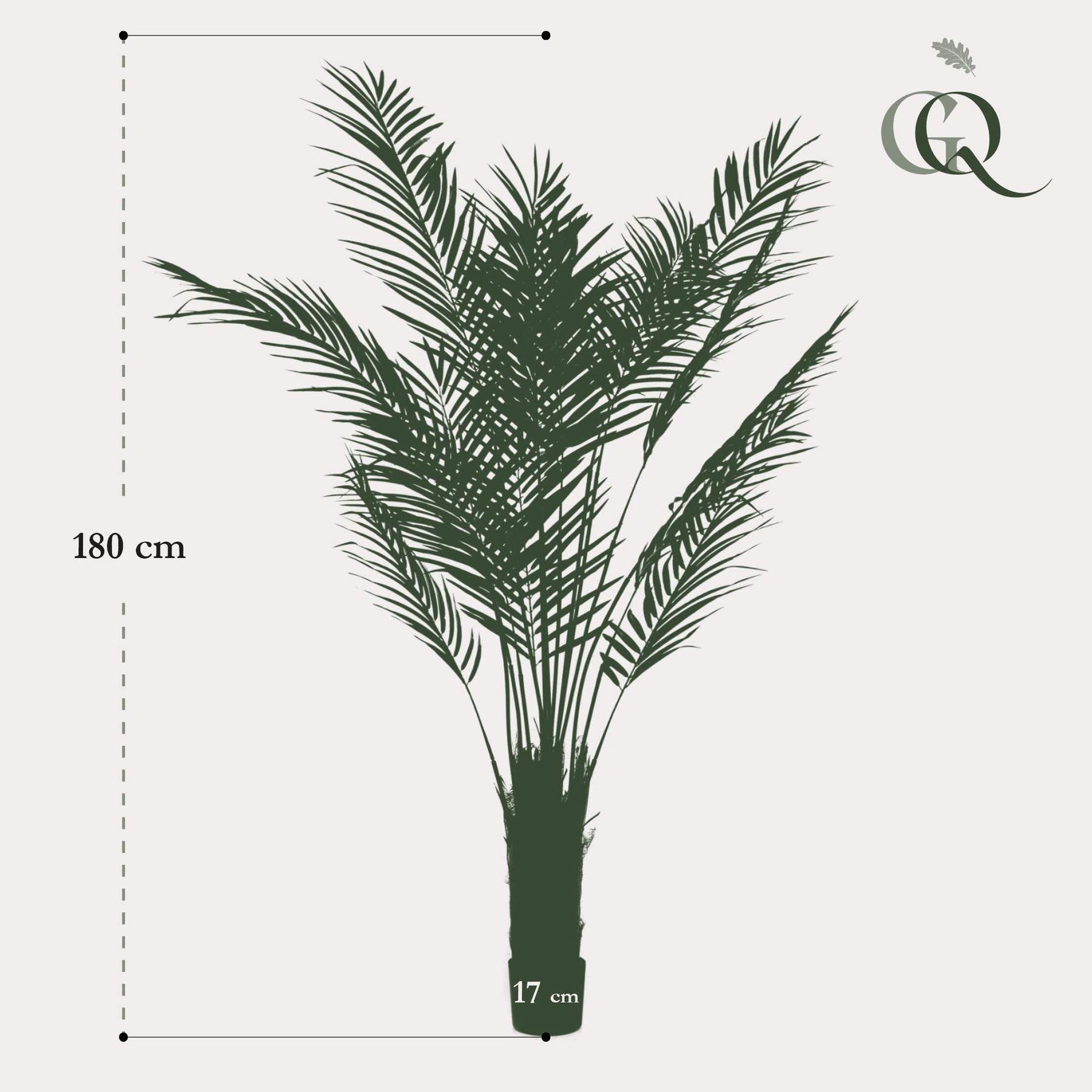 De Areca Lutescens, in het Nederlands de Goudpalm genoemd, komt oorspronkelijk uit Madagascar. Wanneer een echte Areca Lutescens in de volle zon staat, worden de bladeren geel. Maar dat gebeurt niet bij deze mooie kunstpalm, die blijft altijd fris en tropisch groen. Met zijn 180 centimeter is deze kunst Goudpalm een flinke verschijning in elke kamer waar je hem plaatst. Een hele mooie aankoop waar je lang van geniet.