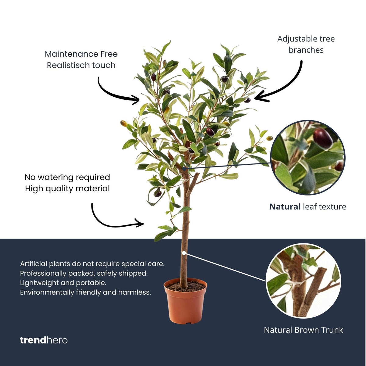 Deze levensechte kunstplant is afgewerkt met oog voor detail – van de realistische olijfbladeren tot de robuuste pot die direct klaar is om neer te zetten. Geen gedoe met water geven of zonlicht: deze olijfboom blijft altijd fris en groen.