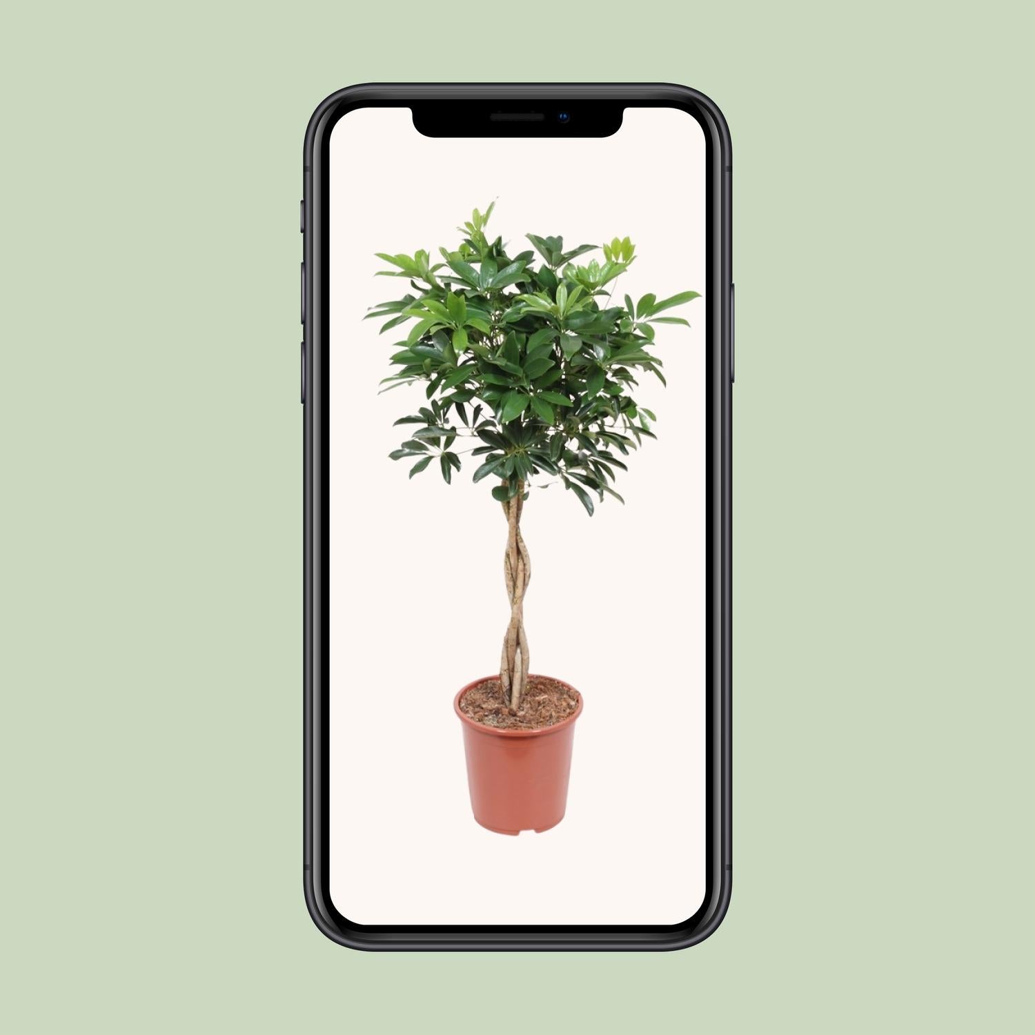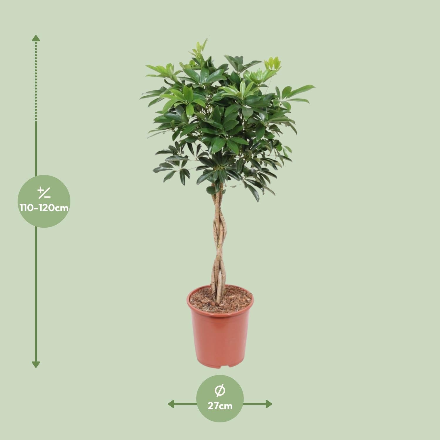 De Schefflera Arboricola 'Compacta' is een prachtige kamerplant die een vleugje elegantie toevoegt aan elke ruimte. Deze plant, ook bekend als de parapluboom, komt oorspronkelijk uit Taiwan en heeft een compacte en bosachtige vorm, waardoor hij perfect is voor kleine ruimtes. Met zijn glanzende, donkergroene bladeren is het echt een blikvanger. Gemakkelijk te verzorgen en ongelooflijk veerkrachtig, is de Schefflera Arboricola 'Compacta' een must-have toevoeging aan je indoor plantencollectie. Breng wat natuurlijke schoonheid in huis met deze prachtige plant. Om voor de Schefflera te zorgen, plaats het op een plek met halfschaduw en geef het eens per week water. De Parapluboom geeft de voorkeur aan goed doorlatende grond, rijk aan organisch materiaal. Het is aanbevolen om de plant elke 2-4 weken tijdens het groeiseizoen te bemesten met evenwichtige kamerplantenmest. Vermijd overbemesting, want dit kan leiden tot verbranding van de wortels. Controleer regelmatig de bladeren op plagen en verwijder eventueel beschadigd of vergeeld blad.Wist je dat Schefflera Arboricola 'Compacta' niet alleen een trendy kamerplant is, maar ook de lucht reinigt? Deze compacte schoonheid is een natuurlijke luchtzuiveraar en verwijdert gifstoffen uit je huis, waardoor de algehele luchtkwaliteit verbetert. Met zijn weelderige, glanzende bladeren en compacte groeiwijze voegt het een vleugje groen en elegantie toe aan elke ruimte. Het is echter belangrijk om te onthouden dat hoewel het er verleidelijk uitziet, deze plant alleen bedoeld is voor decoratieve doeleinden en niet eetbaar is. Dus geniet van de visuele schoonheid van Schefflera Arboricola 'Compacta' en laat het je ruimte opfrissen!De Schefflera Arboricola 'Compacta' heeft een potmaat van 27 cm, waardoor het geschikt is voor kleine tot middelgrote ruimtes.- Deze kamerplant groeit doorgaans tot ongeveer 120 cm hoogte en voegt een vleugje groen en elegantie toe aan elke kamer.- De Schefflera wordt ook vaak de Parasolboom genoemd vanwege zijn kenmerkende parapluvormige bladeren.- Deze plant gedijt goed op een plek met halfschaduw, waardoor het een uitstekende keuze is voor gebieden met indirect zonlicht.- Leuk weetje: De Schefflera staat bekend om zijn luchtzuiverende eigenschappen, die helpen om de kwaliteit van de binnenlucht te verbeteren en een gezondere leefomgeving te creëren.