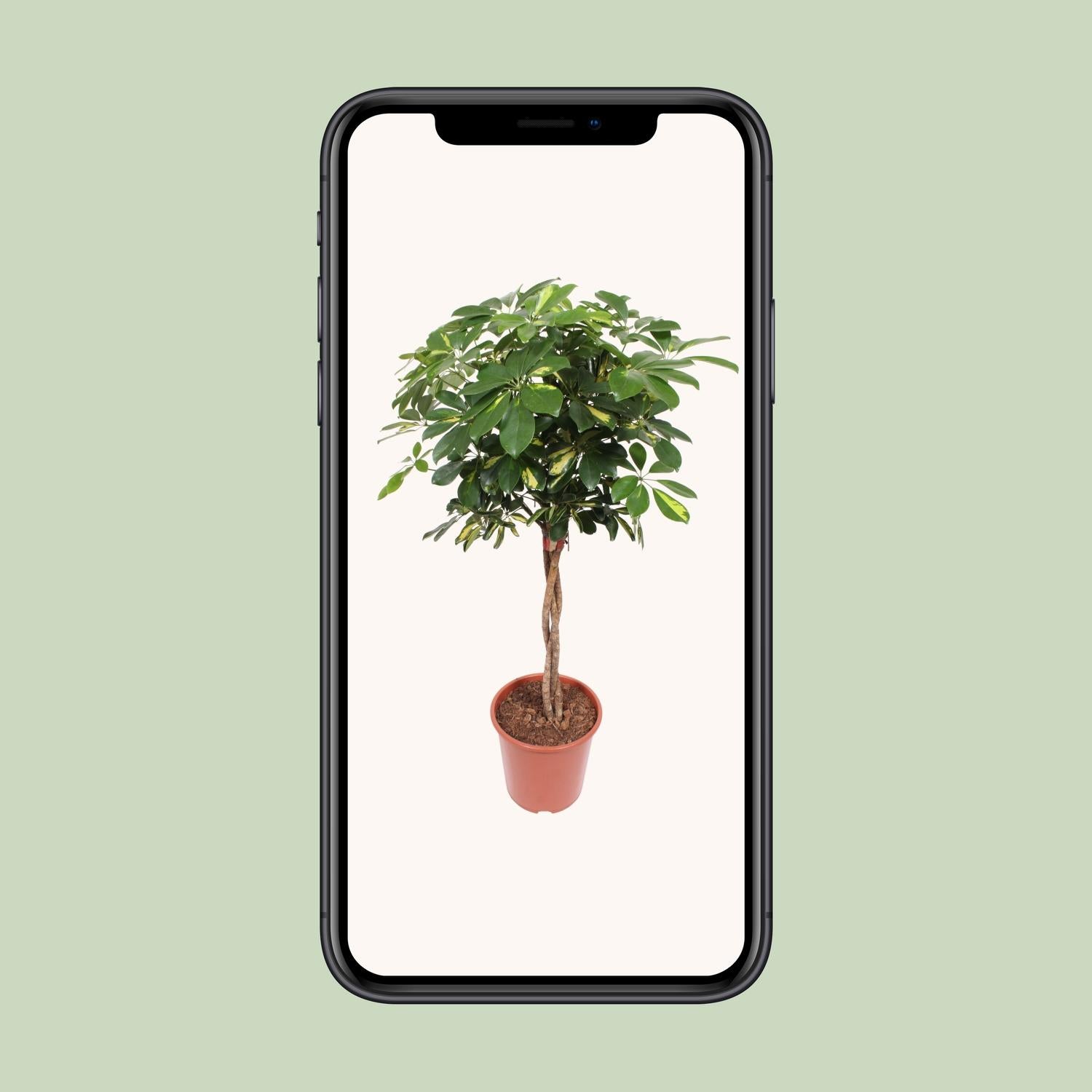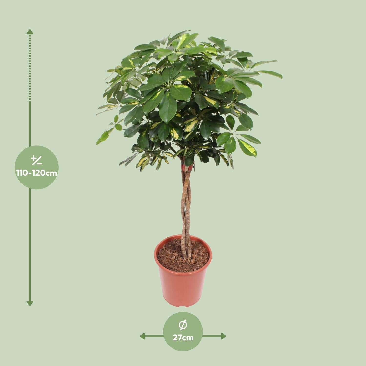 De Schefflera Gold Capella, ook bekend als de Parapluboom, is een prachtige kamerplant die een vleugje elegantie toevoegt aan elke ruimte. Afkomstig uit Taiwan, heeft deze tropische schoonheid heldere, gevlekte bladeren die op paraplu's lijken en een opvallende visuele aantrekkingskracht creëren. Met zijn compacte formaat en lage onderhoudsvereisten is het ideaal voor zowel beginners als ervaren binnen tuiniers. Of het nu in de woonkamer, kantoor of slaapkamer wordt geplaatst, de Schefflera Gold Capella verlicht moeiteloos de ruimte met zijn gouden tinten en weelderige bladeren. Haal een stukje tropen in huis met deze prachtige kamerplant. Om voor Schefflera te zorgen, zoek een plek met halfschaduw, aangezien deze plant indirect zonlicht verkiest. Geef de plant één keer per week water, maar zorg ervoor dat de bodem goed draineert. Plant hem in goed doorlatende grond, bij voorkeur een mengsel van veenmos, perliet en potgrond. Bemest de schaduwplant elke twee tot drie weken tijdens de lente- en zomermaanden met een evenwichtige vloeibare meststof. Vermijd echter bemesting tijdens de wintermaanden. Controleer regelmatig op plagen en snoei eventuele dode of vergeelde bladeren om de gezondheid en het uiterlijk te behouden.Wist je dat Schefflera Gold Capella, ook bekend als de parapluboom, een populaire kamerplant is die tropische vibes brengt in elke ruimte? Deze prachtige plant, met zijn glanzende groene en goudkleurige gevarieerde bladeren, is niet alleen een prachtige toevoeging aan je interieur, maar staat ook bekend om zijn luchtzuiverende eigenschappen. Het is echter belangrijk op te merken dat deze plant puur voor decoratieve doeleinden is en niet eetbaar. Weersta dus de verleiding en geniet van zijn schoonheid zonder een hapje te nemen!- Schefflera Gold Capella heeft een potmaat van 27 cm.- Deze plant is ongeveer 120 cm hoog.- Schefflera staat ook bekend als de Parapluboom.- Deze plant gedijt goed op een plek met gedeeltelijke schaduw.- Leuk feitje: Schefflera staat bekend om zijn luchtzuiverende eigenschappen, waardoor het een geweldige toevoeging is aan elke binnenruimte.